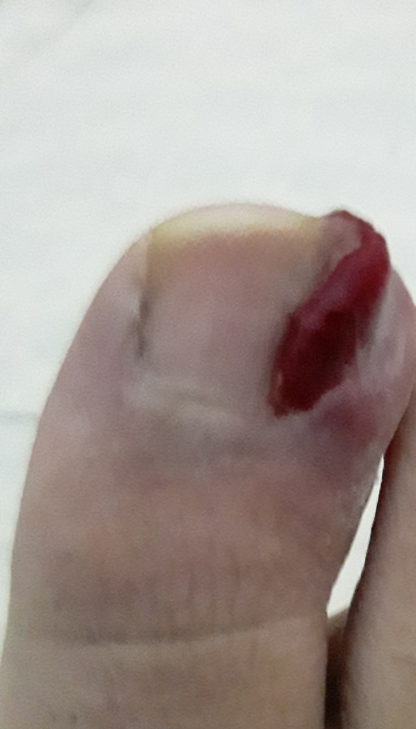 عندما كنت أقوم بقطع أظافر أصابع القدم وعندما قمت بقص ظفر أصبح القدم الأكبر ظل قليل منه فقمت بانتزاعه بيدي فانتزعت حتى الجزء الذي يغطي ظفر أصبح القدم من الجهة اليمنى فبدأ صديد يخرج من تلك المنطقة بدون توقف ثم تتكون قشرة في أحد الأيام قمت بتقشير تلك القشرة التي تكونت في أصبع قدمي الكبير قبل الاستحمام وعندما كنت أستحم دخل الماء إلى أصبع القدم فخرج شيء أحمر يشبه اللحم ظهر منه قليل فقط فعندما ضربت أصبع قدمي الأكبر مع الطاولة انتفخ ذلك الشيء وخرج وأصيب أصبع قدمي الكبير بالتهاب يرافقه ألم حارق أريد من فضلكم معرفة ماهذا الشيء الأحمر الذي خرج من أصبع قدمي الكبير وماهي سبل العلاج وشكرا
