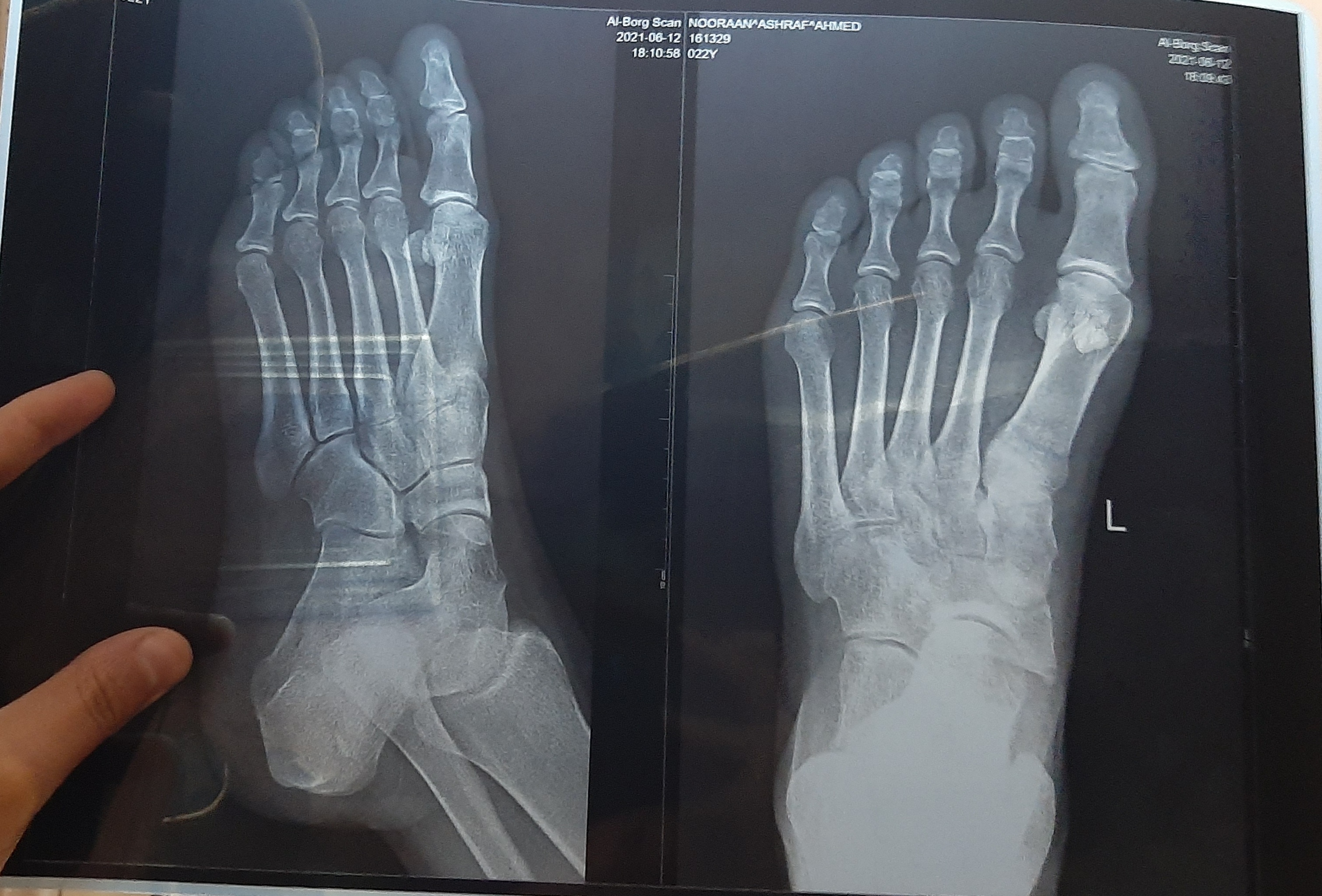 الأشعة لايوحد بها شرخ أو كسر.. ممكن يكون سبب الألم التواء في الأربطه والأوتار... ينصح بوضع رباط ضاغط علي القدم المصابه.. والعلاج Xefo8mg قرص مرتين بعد الاكل.. ودهان voltaren emulgelمره واحده قبل وضع الرباط يومياً
