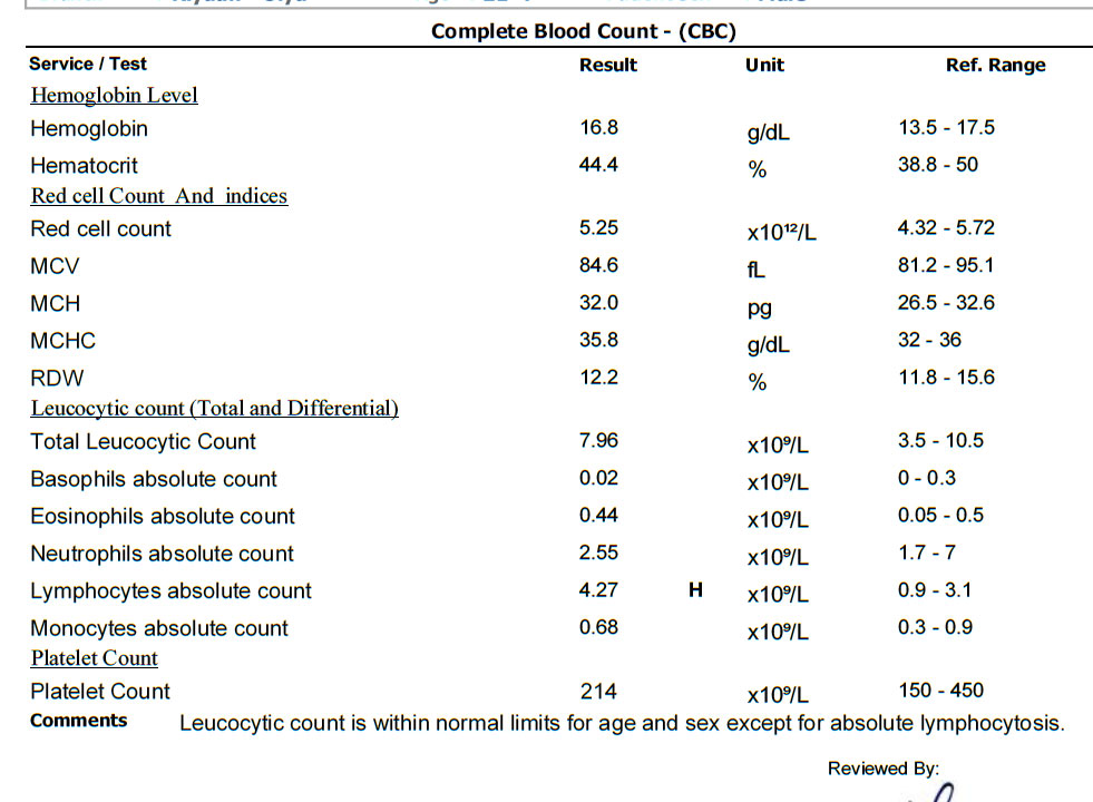 لقد اجريت تحليل همجلوبين و كانت النتيجة 17.7 هل هذا طبيعي ؟ حيث اني اعاني من بعض المشاكل الصحية كمشاكل هضمية و دوخة مستمرة ، نقصان بالوزن و الام بالصدر ، و احمرار شديد و الم في الاقدام عند الوقوف هل لها علاقة بارتفاع الدم ؟ و ما هو العلاج ؟