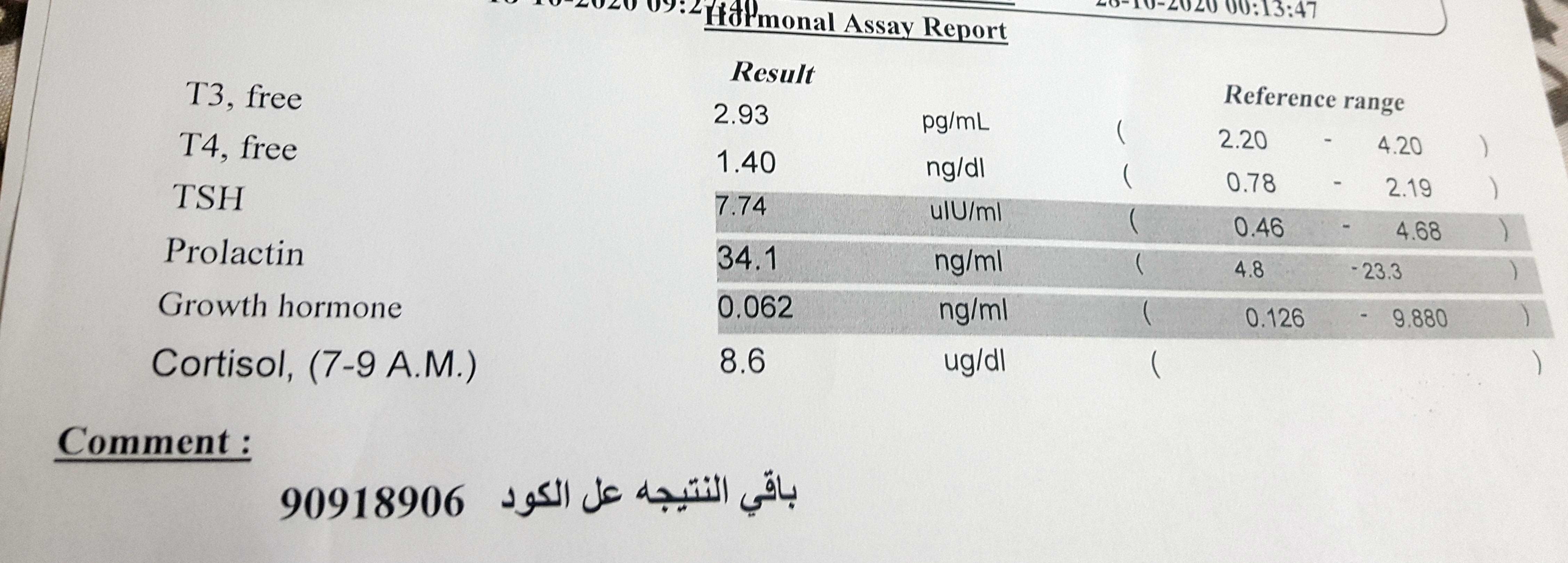 اعاني من ورم ع الغدة النخامية من عام ٢٠٠٧ وتم اخد علاج دوائي من ٢٠٠٧ الى ٢٠٠٨ الى ان نزلت معدل التحاليل لمعدلات الطبيعية وتم وقف العلاج...وهذه اخر تحاليل اتعملت