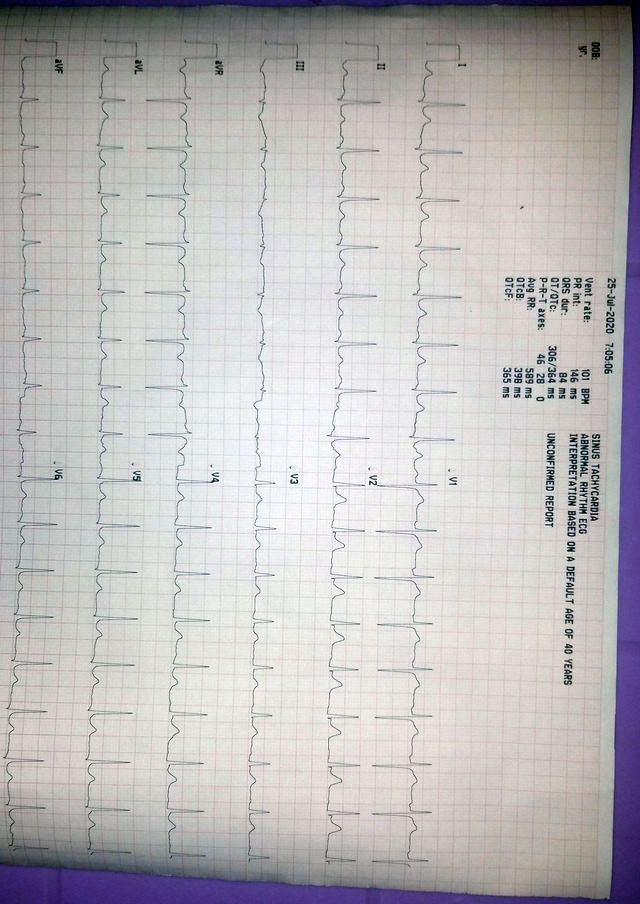 منذ حوالي اسبوع وانا اشعر بالتعب، تعرق وصداع خفيف واحياناً ألم بسيط في العين اليسرى مع شعور بعدم الإرتياح، قمت بالذهاب الى المستشفى لقياس الضغط وكانت النتيجة 13/8 وقمت بعمل تخطيط للقلب ارفقت لكم صورة عنه.