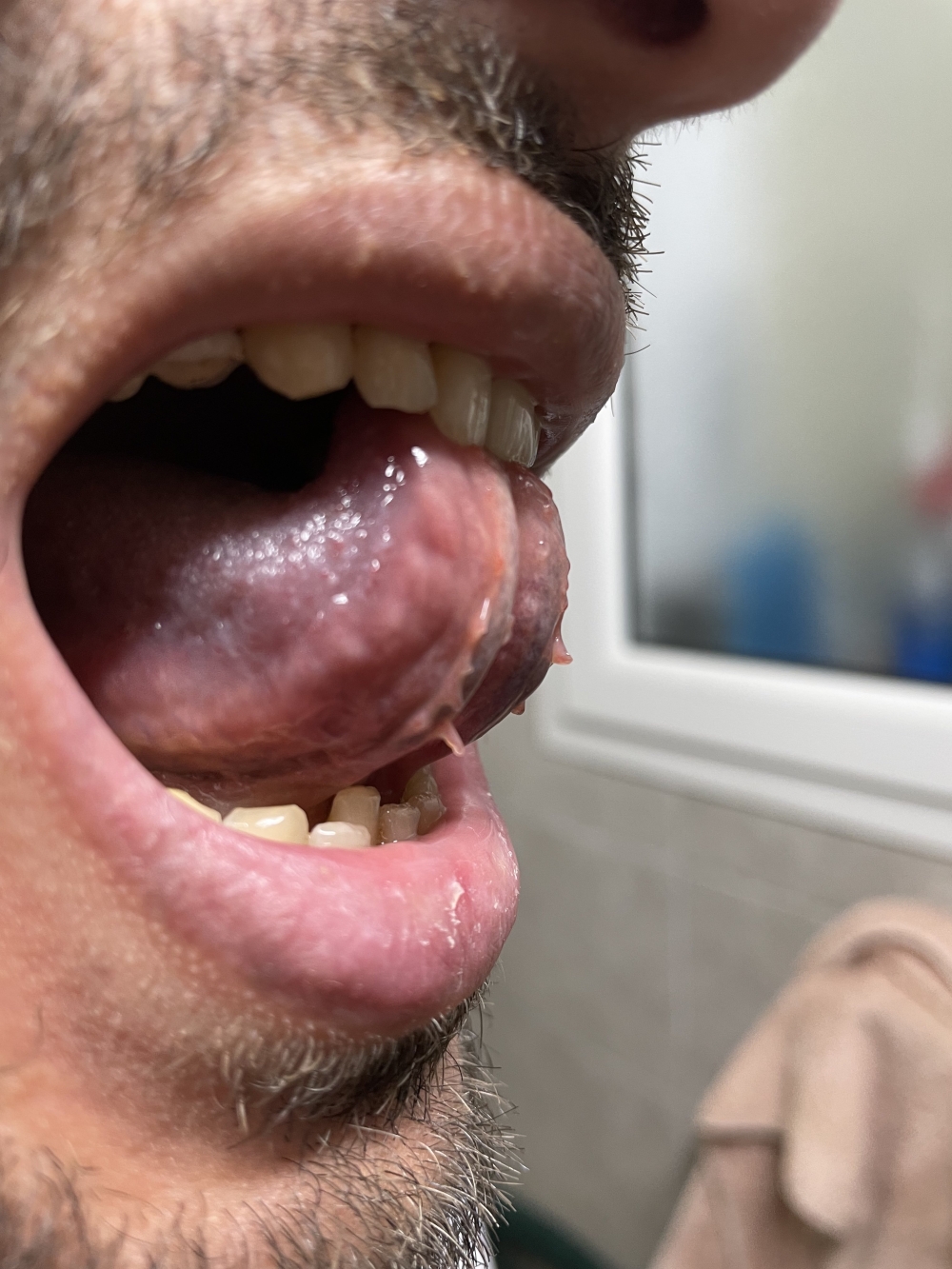 هذا التهاب باللسان وله اسباب عديده ممكن تكون بسبب فطريات أو نقص فيتامينات أو التهاب كيمياءي بسبب ارتجاع حمض المعده أو بسبب الاكل والمشروبات ساخنه بشكل زاءد