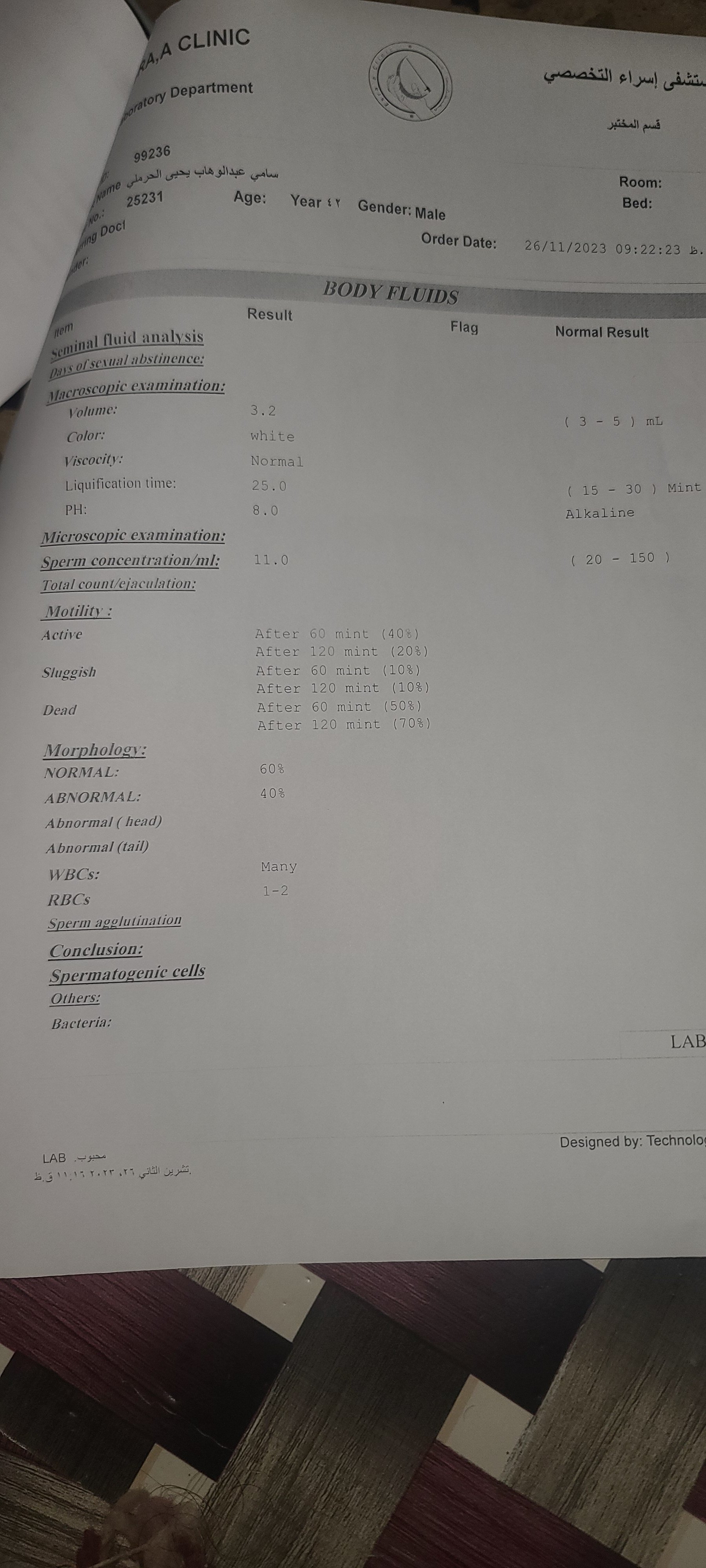 أعاني من نقص في عدد الحيوانات المنوية حيث تبلغ في آخر فحص ١١ وانخفاض في الرغبة الجنسية