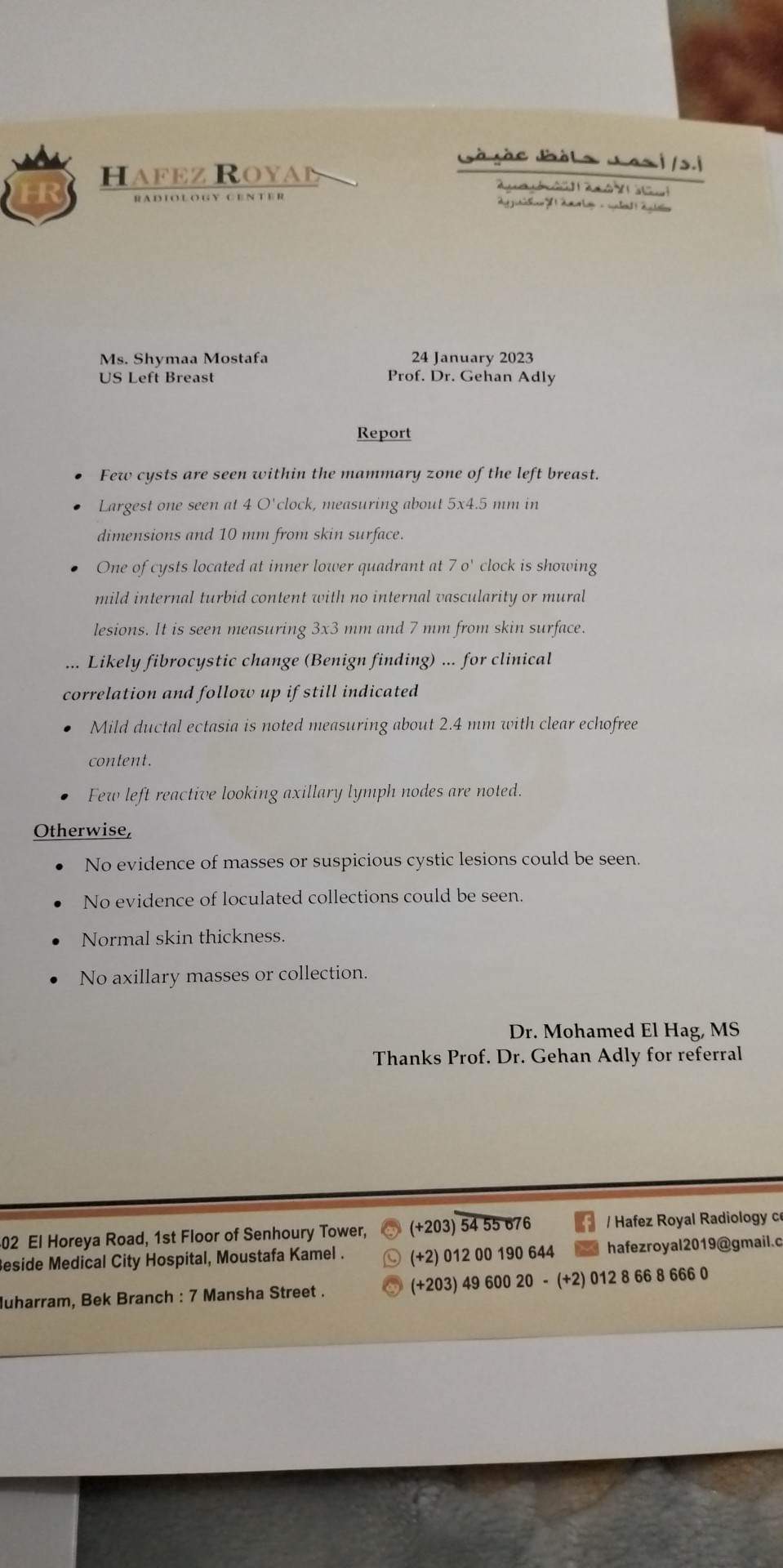 كان عندي من سنتين اتنين كيس بالثدي الايسر ولكن هذه الفتره اتحسسه ولم أجده ولكن كنت من وقت لآخر أشعر بوخز والم بالثدي الأيسر ومنذ شهرين حدث حمل ولكن لم يكتمل و حصل اجهاض ورجع الم الثديين عندي بطريقه مؤلمه مع الم بالصدر أثناء التنفس و الم بالظهر و الكتف ذهبت لطبيب أورام اكدلي أن لا يوجد شىء وعملت سونار لم يوضح وجود شئ عملت اشاعه علي الكتف و علي الرئه أيضا لا يوجد شىء ولكم الالم موجود و القلق ولا اعرف ما افعل ولا اين اذهب ارجو المساعده