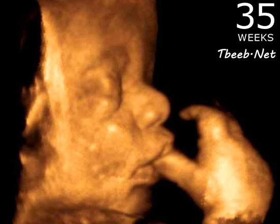 ويزن الطفل في الأسبوع الرابع والثلاثين من الحمل حوالى خمسة أرطال ونصف (نحو 2400 غ), ويبلغ طوله حوالى 12 بوصة ونصف (نحو 32 سم) وذلك من الرأس وحتى الردف.